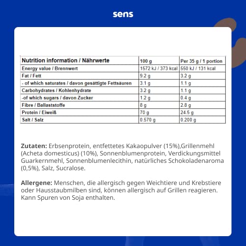 Sens - Schoko-Insekt-Proteinpulver aus Grillen - Nachhaltige Sportnahrung mit 70% Proteingehalt - Protein ohne Laktose und Chemie (Schokolade, 650g)